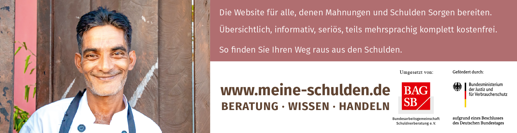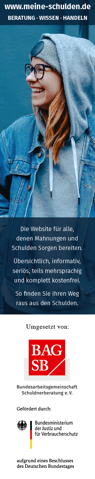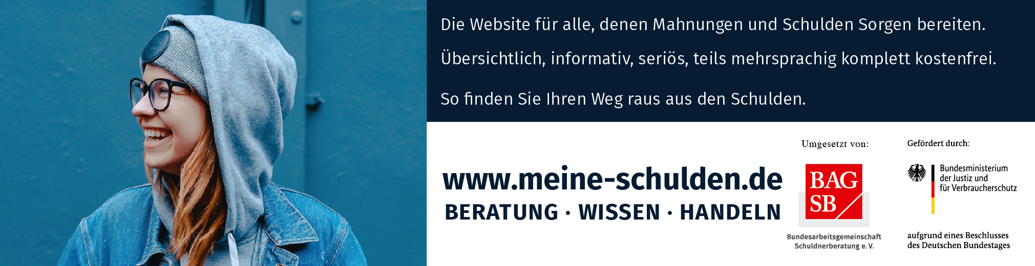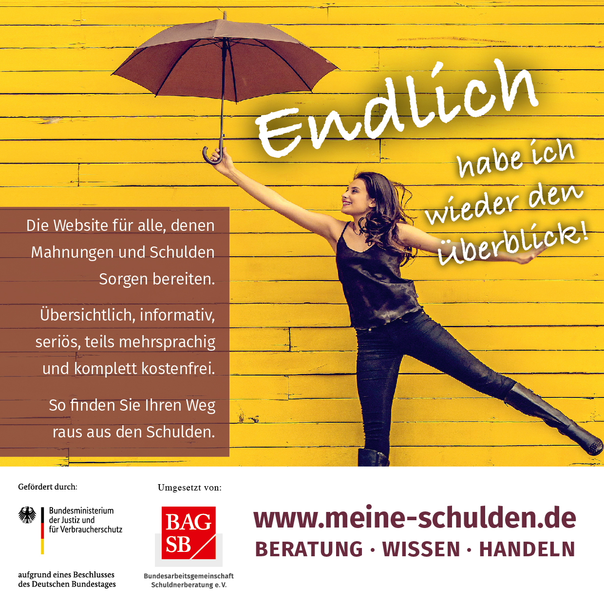 Sie können durch Verlinkungen auf anderen Websites, Posts in Sozialen Medien oder den Anzeigendruck in Printmedien aktiv helfen, auf die Situation ver- und überschuldeter Menschen aufmerksam zu machen. Über die Bekanntmachung der Seite www.meine-schulden.de helfen Sie, konkrete und seriöse Hilfeangebote vorzustellen und über die Arbeit der Sozialen Schuldnerberatung aufzuklären.