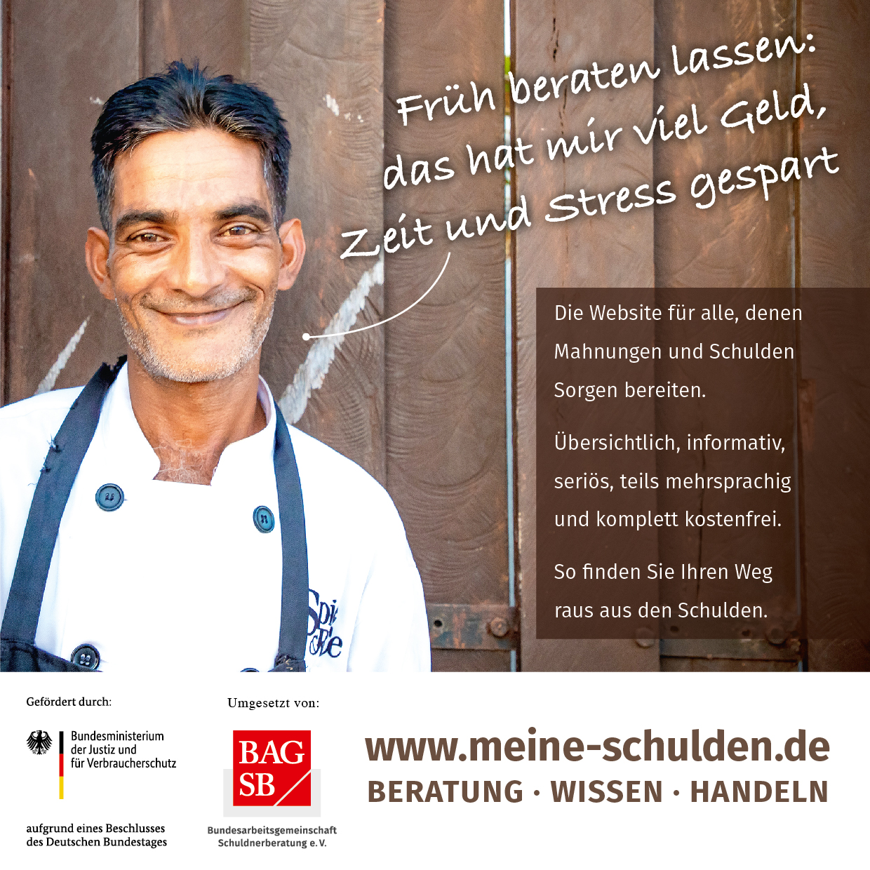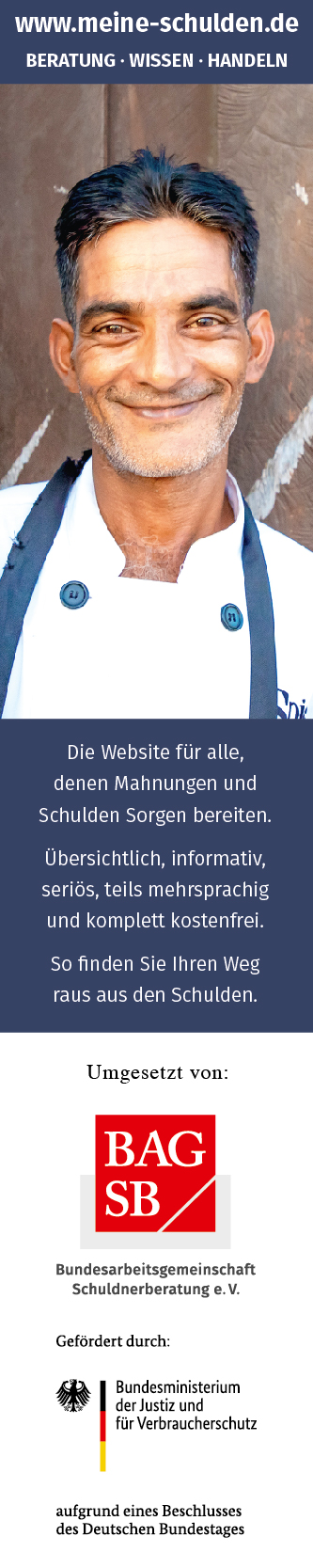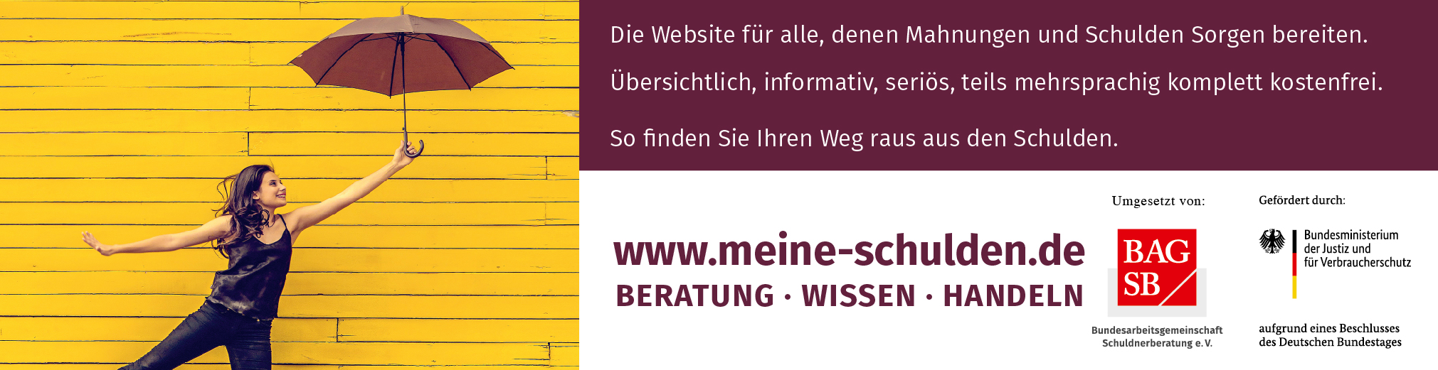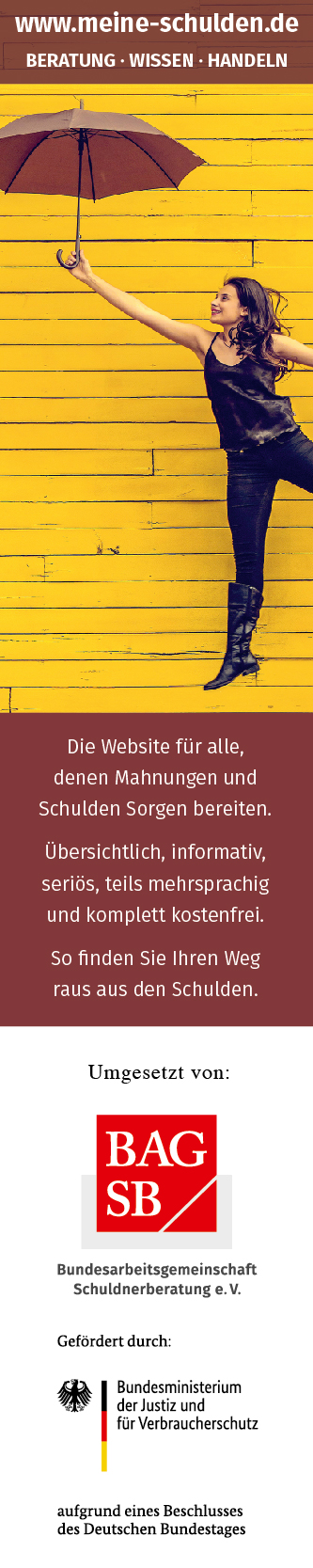 Sie können durch Verlinkungen auf anderen Websites, Posts in Sozialen Medien oder den Anzeigendruck in Printmedien aktiv helfen, auf die Situation ver- und überschuldeter Menschen aufmerksam zu machen. Über die Bekanntmachung der Seite www.meine-schulden.de helfen Sie, konkrete und seriöse Hilfeangebote vorzustellen und über die Arbeit der Sozialen Schuldnerberatung aufzuklären.